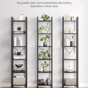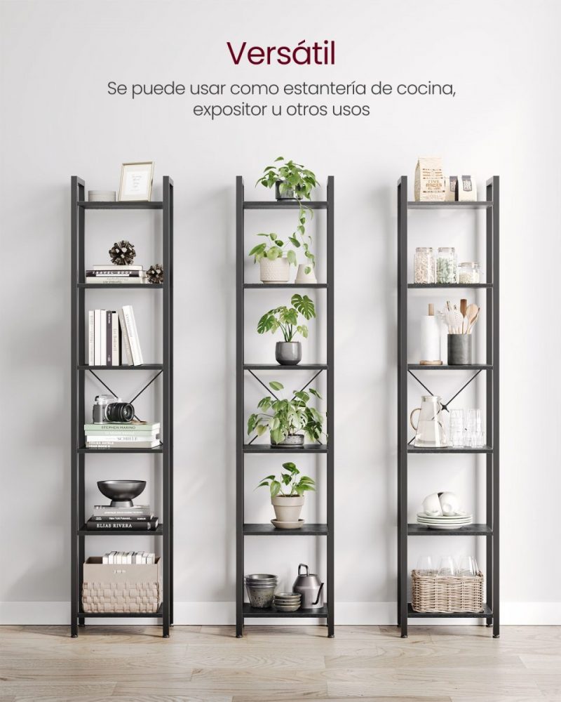 Esta estantería no es solo un mueble, sino un narrador de historias, con seis niveles para separar y destacar los diferentes capítulos de tu vida. Desde libros y figuras hasta trofeos y plantas, cada repisa ofrece el espacio perfecto para organizar y exhibir tus pasiones con estilo. Transforma cualquier rincón en una galería personalizada de tus intereses y recuerdos.