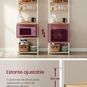 Calidad Superior: La combinación de un marco de acero robusto y tableros de aglomerado duraderos garantiza que esta estantería sea sólida y estable, capaz de soportar tu microondas, cafetera y otros accesorios de cocina con facilidad.