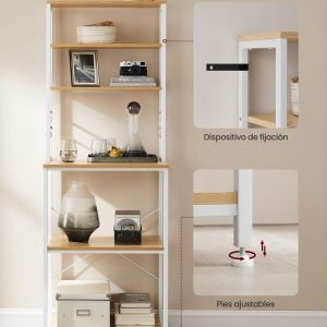 Pies Ajustables y Fijación a la Pared: Equipada con patas ajustables para una estabilidad óptima sin rayar el suelo y un dispositivo de fijación para asegurarla a la pared, esta estantería ofrece tranquilidad en hogares con niños o mascotas.