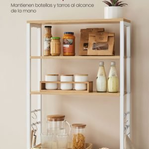 Nuestra estantería de cocina no solo optimiza el espacio y el almacenamiento sino que también introduce un elemento de diseño sofisticado en tu hogar. Perfecta para aquellos que buscan mejorar su entorno de cocina con una solución elegante y práctica.