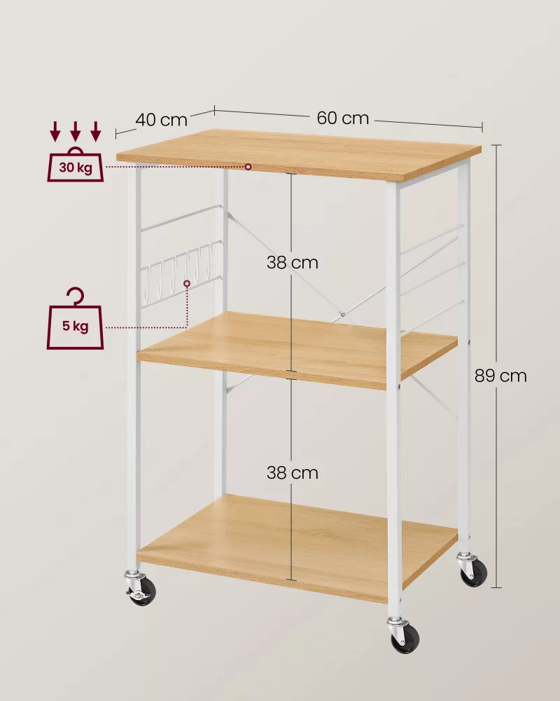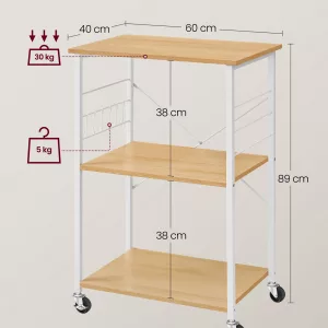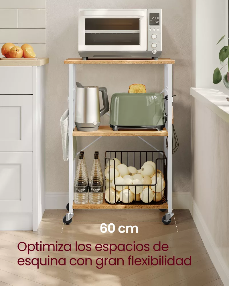 Diseñada pensando en la funcionalidad y la eficiencia, esta estantería no solo ofrece un hogar para tu microondas sino también espacio adicional para otros utensilios de cocina. Con unas dimensiones inteligentes de 40 x 60 x 89 cm y estantes espaciados en 38 cm, su diseño compacto se adapta perfectamente a espacios reducidos, brindando un aspecto organizado y estilizado a tu cocina.
