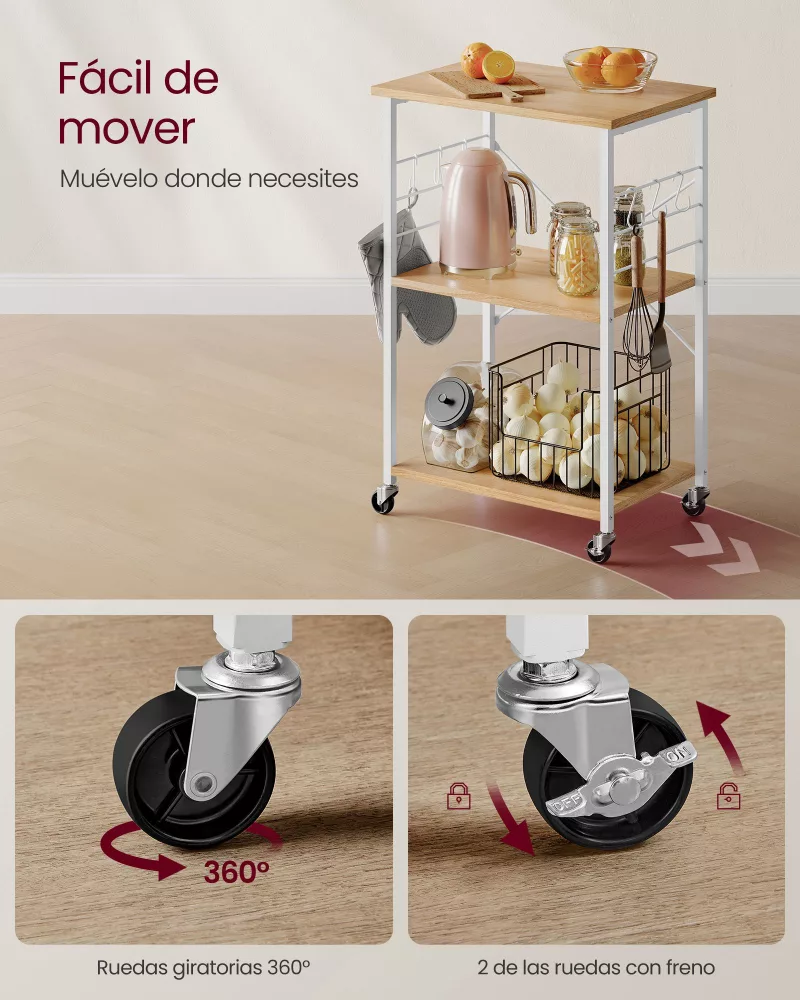 Movilidad sin Esfuerzo: Equipada con 4 ruedas universales, de las cuales 2 cuentan con freno, esta estantería se puede mover fácilmente a cualquier parte de tu cocina. La flexibilidad de detenerla en cualquier lugar permite una cocina más dinámica y adaptativa.