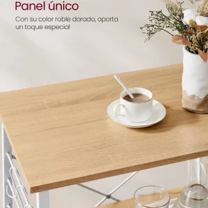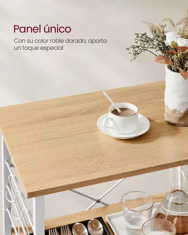 Construcción Robusta y Duradera: El uso de materiales de alta calidad como el aglomerado y el acero garantiza la durabilidad de esta estantería. Además, está reforzada con soportes en forma de X en la parte trasera, asegurando un soporte sólido para todos tus utensilios de cocina.