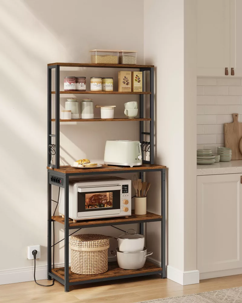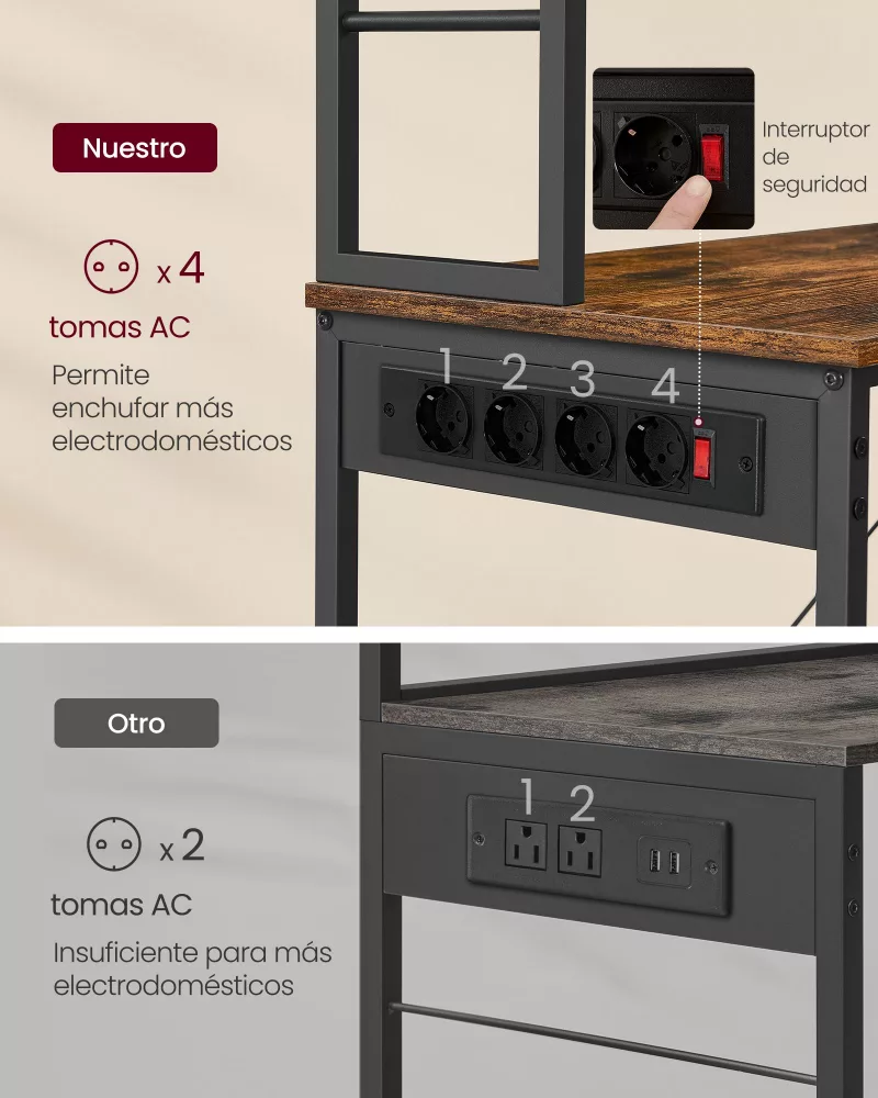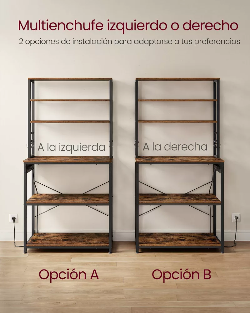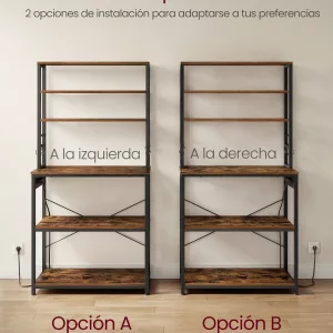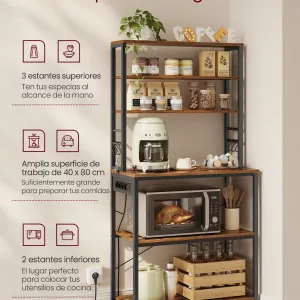 Marco Sólido: Construida con un marco de acero robusto y tableros de aglomerado duradero, esta estantería es fuerte y estable, capaz de sostener microondas, cafeteras y otros accesorios de cocina con facilidad.