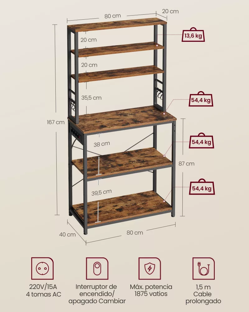 Diseñada para maximizar el almacenamiento y mantener todo al alcance de la mano, esta estantería es ideal para cocinas compactas o para crear una mini cafetería en tu hogar. Con un marco sólido, múltiples estantes y ganchos para utensilios, es la solución perfecta para quienes buscan combinar estilo y funcionalidad en su cocina.