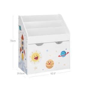 Con 3 compartimentos abiertos en la parte superior, esta estantería es perfecta para guardar libros de diferentes tamaños. Además, cuenta con una caja de juguetes con ruedas que tu pequeño puede sacar fácilmente para acceder a su colección de juguetes después de una sesión de lectura.