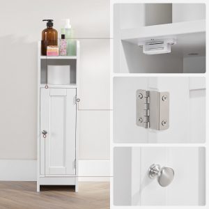 - Gran Capacidad de Almacenamiento: A pesar de su diseño compacto, este armario ofrece amplio espacio para organizar desde plantas decorativas en la parte superior, productos de aseo en el centro, hasta los objetos más personales detrás de la puerta, manteniendo el baño ordenado y libre de desorden.