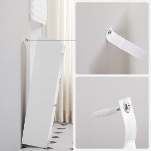 - Ajustabilidad y Limpieza Fácil: Con estantes ajustables detrás de la puerta, este mueble puede adaptarse para albergar objetos de diferentes tamaños. Además, la superficie de MDF con acabado lacado no solo le da un aspecto refinado sino que también facilita su limpieza.