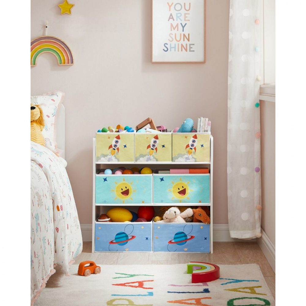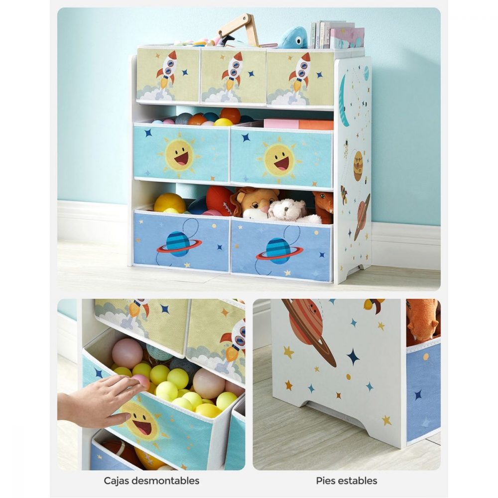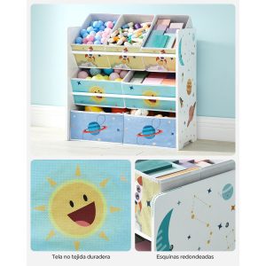 Esta estantería no solo es funcional, sino también un elemento decorativo. Sus colores vivos y los divertidos motivos del espacio, el sol y el cohete, crean un ambiente alegre y estimulante, ideal para cualquier habitación infantil.