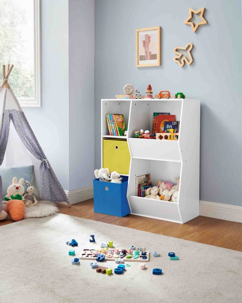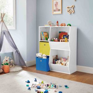 Este organizador de almacenamiento multifuncional no es solo un mueble, ¡es un centro de aventuras para tus hijos! Equipado con 4 ranuras para juguetes, 2 estantes para libros, 2 contenedores de tela para materiales de arte y una pizarra divertida, ofrece un espacio de juego ilimitado y fomenta la creatividad.
