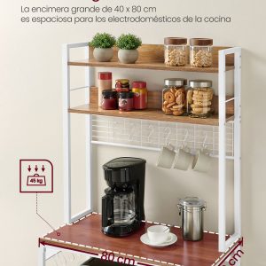 El estante central (carga de 59 kg) de esta estantería cocina se puede ajustar hacia arriba o hacia abajo en 4,1 cm para adaptarse a los aparatos de diversos tamaños, desde una pequeña tostadora a tu licuadora y microondas.