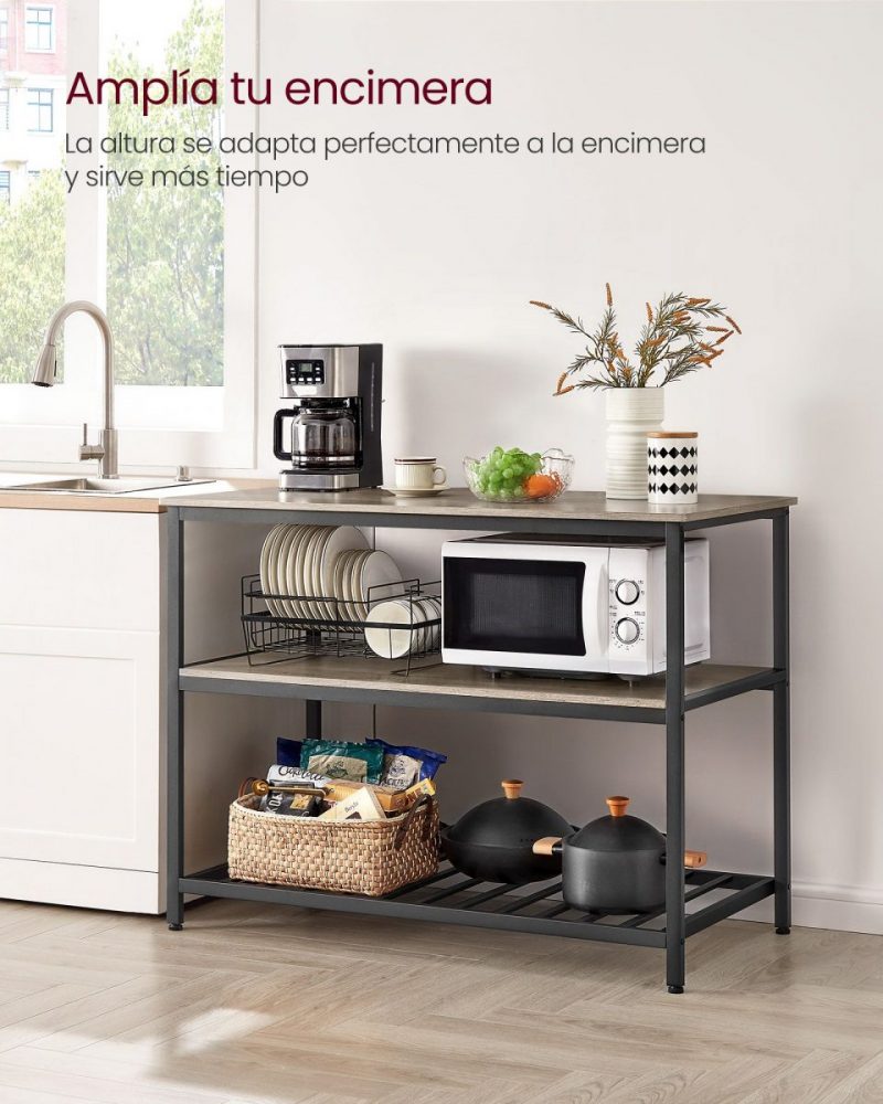 - Almacenamiento Inteligente: Equipada con 3 niveles de almacenamiento, esta isla de cocina te permite organizar desde teteras y electrodomésticos hasta cajas y utensilios, manteniendo todo accesible y ordenado.