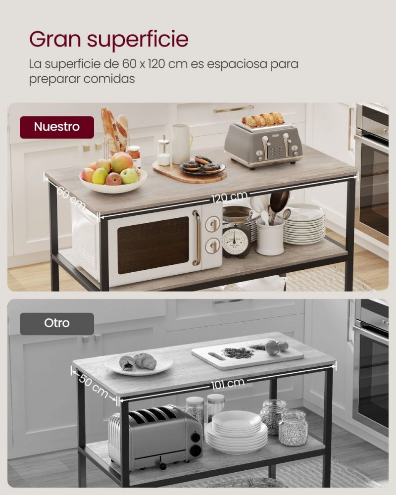 - Amplia Encimera: La generosa superficie de 60 x 120 cm te permite preparar alimentos cómodamente, al mismo tiempo que ofrece espacio para electrodomésticos esenciales como tostadoras o cafeteras, garantizando una gran comodidad en tu día a día.