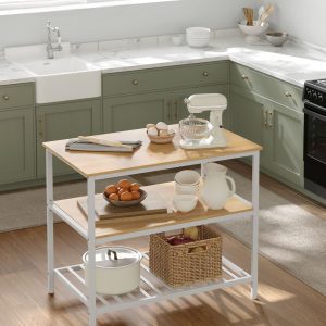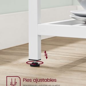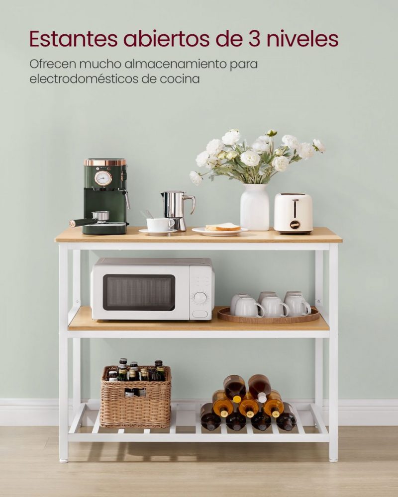 - Almacenamiento de Tres Niveles: Ofrece una organización eficiente con su estantería de tres niveles, perfecta para colocar una variedad de artículos desde teteras y electrodomésticos hasta cajas y utensilios.