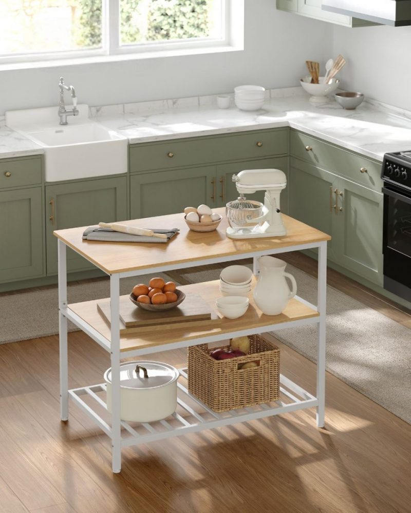 Esta isla de cocina no solo es una solución práctica para tus necesidades de preparación de alimentos y almacenamiento, sino también una elegante adición a tu cocina. Su diseño funcional y estético la convierte en una pieza central ideal para cocinas modernas, proporcionando comodidad y eficiencia en tu espacio culinario.