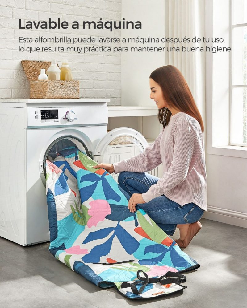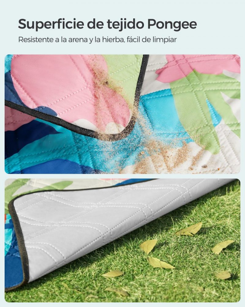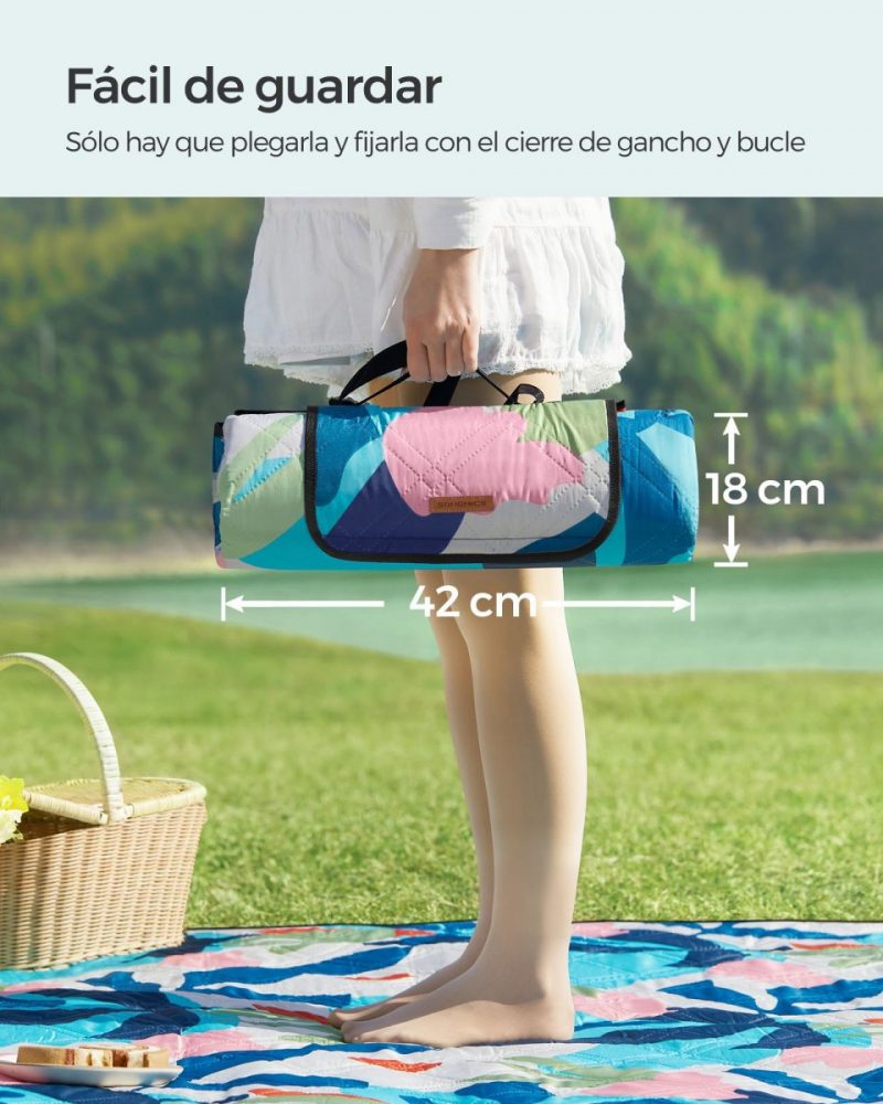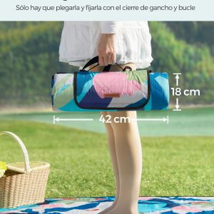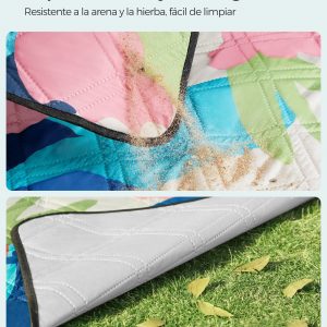 Disfruta de los Grandes Espacios Exteriores Ya sea para un picnic de primavera, un campamento de verano, un festival musical o para tomar el sol, esta manta de picnic es tu accesorio para cuando estés en el parque, el patio, la playa o el retiro en el campo. Hecha de Calidad Con una suave tela de pongee en la parte superior, un fondo de aluminio impermeable y un acolchado de esponja en el medio, esta manta es cómoda e impermeable. Simplemente dóblala en un tamaño pequeño y llévala en tus viajes.