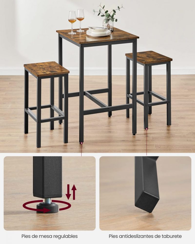 Si buscas un mueble multifuncional que se adapte a varios espacios y necesidades, ¡aquí lo tienes! Este conjunto de mesa y taburetes es ideal tanto para comenzar el día con un desayuno acogedor en la cocina, disfrutar de una copa de vino por la noche, o montar un práctico espacio de trabajo en casa.