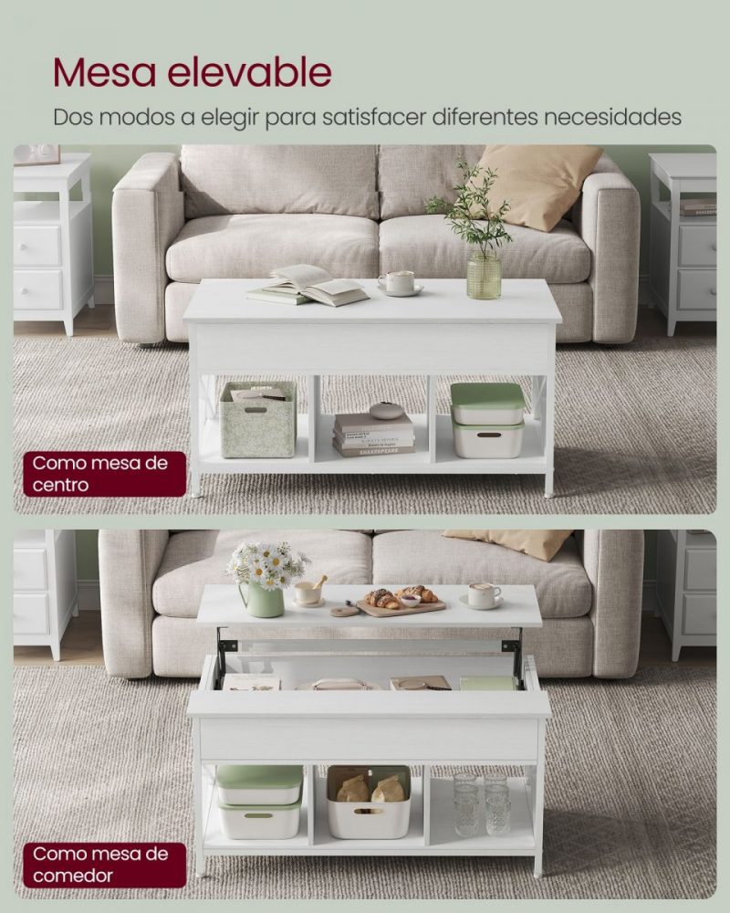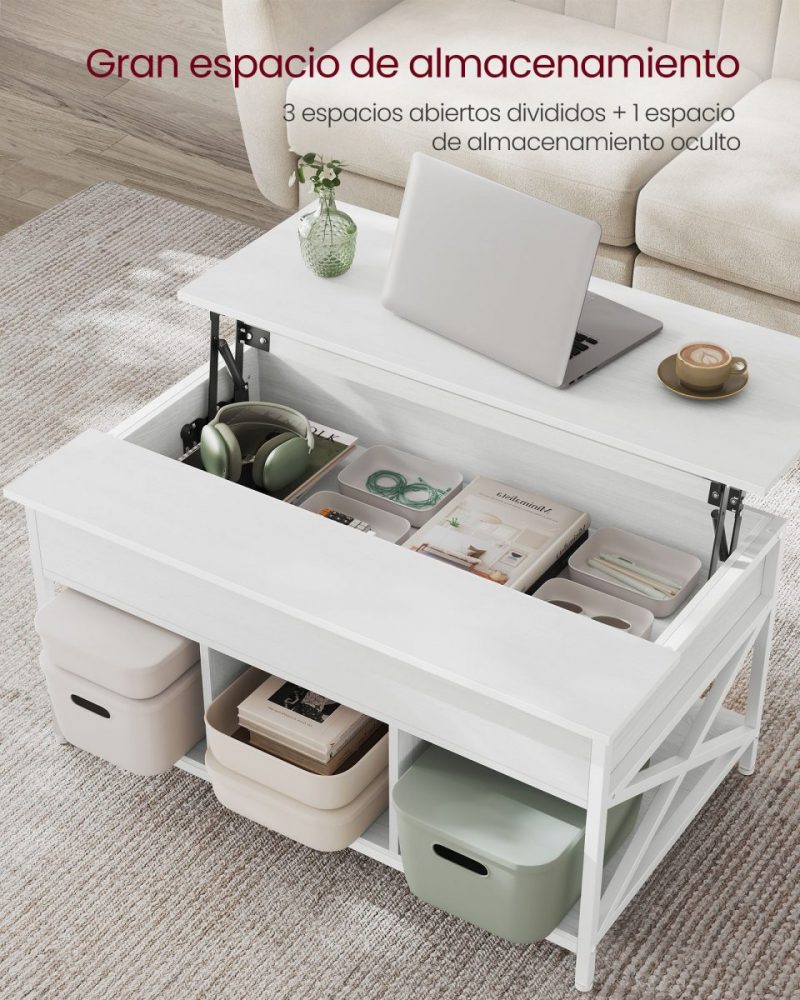 Nuestra mesa no solo ofrece una superficie elevable para tu comodidad, sino que también integra 3 compartimentos abiertos para mantener juegos de mesa, libros y manualidades al alcance de la mano. Además, el compartimento oculto bajo la tapa es ideal para almacenar aquellos objetos que prefieres mantener fuera de la vista de tus invitados, manteniendo así un ambiente ordenado y acogedor.