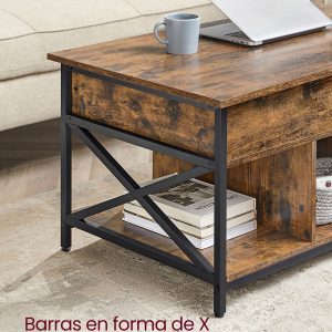 Las patas de acero con acabado industrial, combinadas con el cálido tablero en tono Marrón Roble y las barras decorativas en forma de X, confieren a esta mesa un carácter único que complementará cualquier decoración. Su diseño no solo es funcional, sino también un elemento de decoración que aportará personalidad y calidez a tu salón.