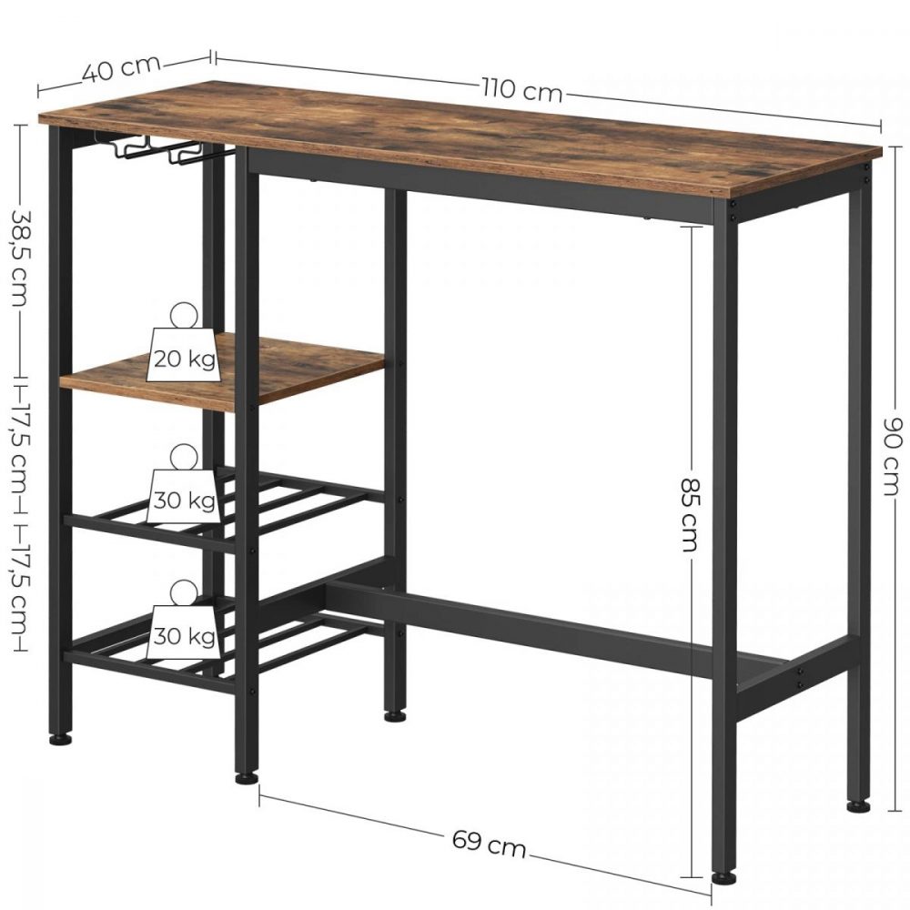 Esta mesa de bar no solo es una pieza de mobiliario, es una invitación abierta a disfrutar de buenos momentos. Equipada con estantes, botelleros y portavasos integrados, elevada por un marco de acero negro y paneles de madera en tono marrón rústico, esta mesa combina funcionalidad y estilo para crear un ambiente acogedor en tu hogar.