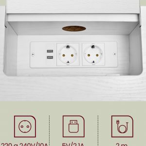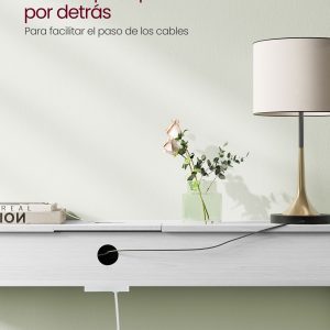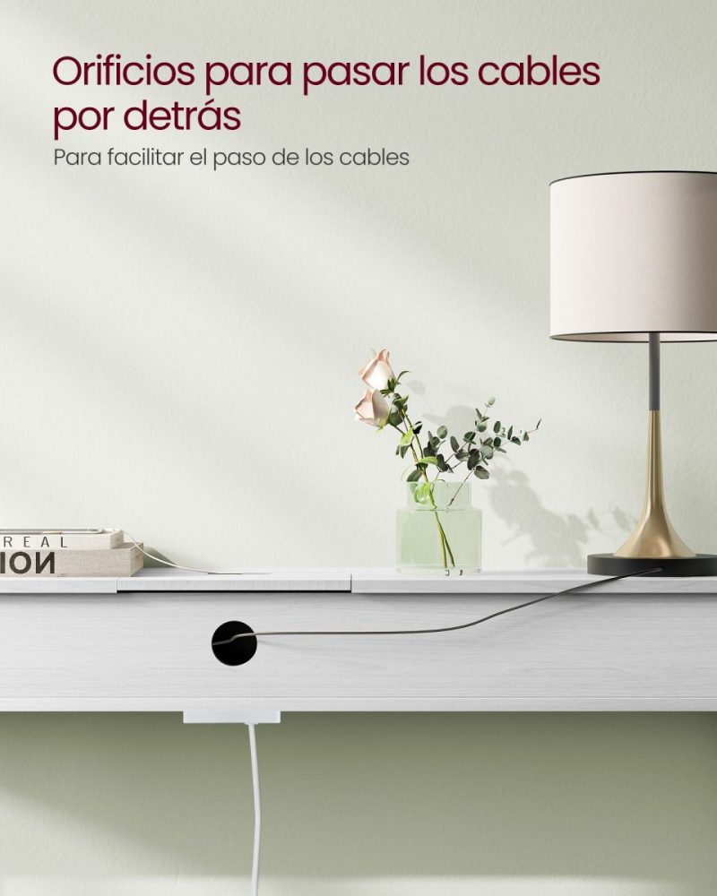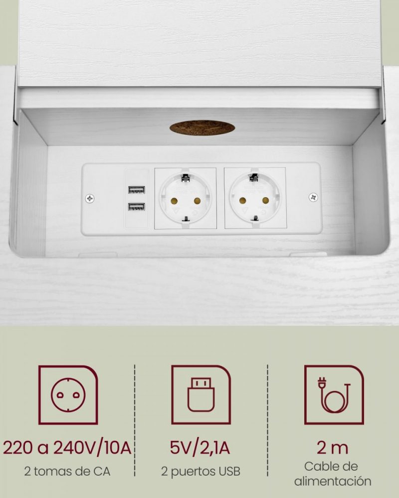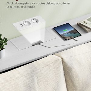 La regleta de enchufes, estratégicamente oculta en un compartimento fácilmente accesible, y el orificio de gestión de cables en la parte posterior, aseguran un espacio de trabajo limpio y libre de desorden. Esta funcionalidad se combina con un diseño elegante para ofrecer una mesa de almacenamiento que no solo es práctica sino también un complemento decorativo para cualquier habitación.