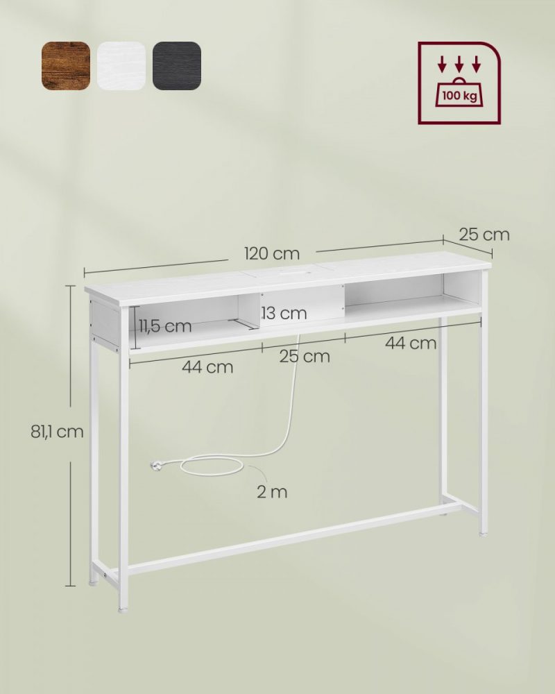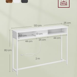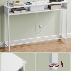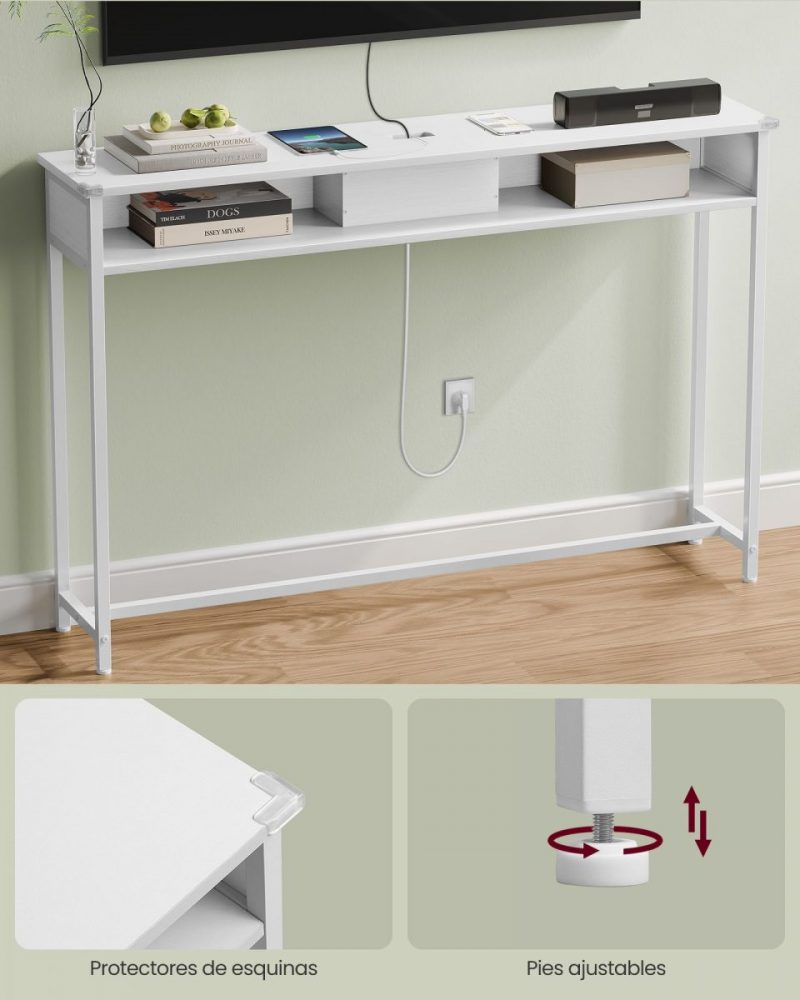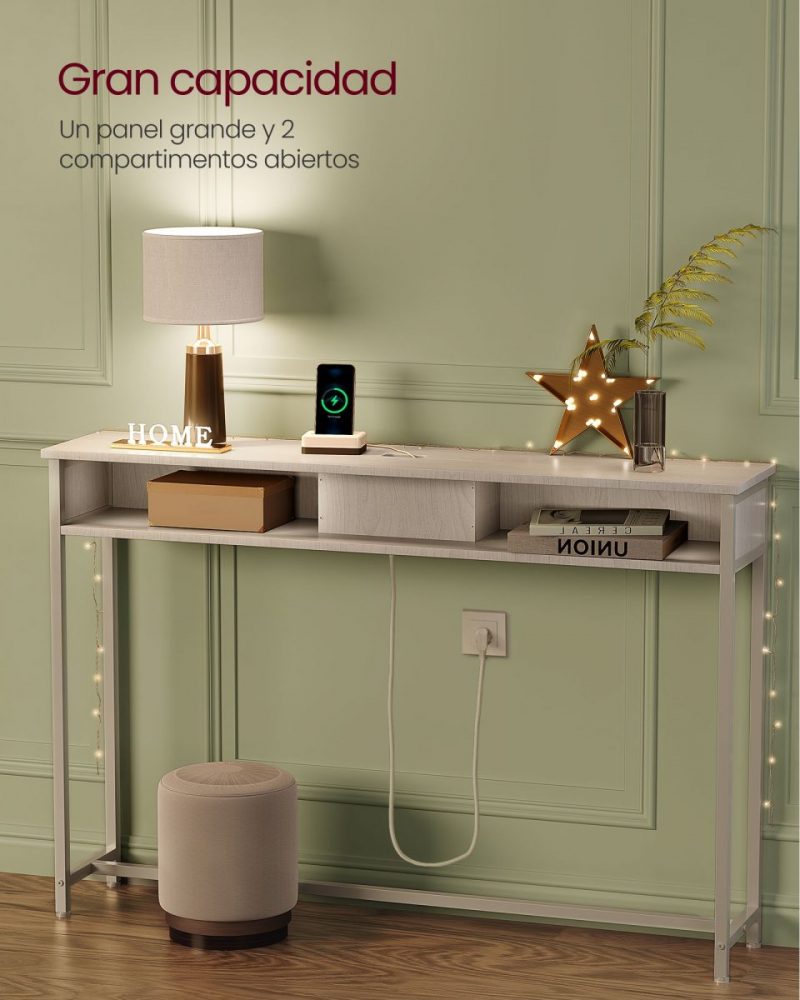 Ya sea en el pasillo como punto de llegada, detrás del sofá para mantener tus dispositivos cargados, o como un elegante expositor de adornos junto a la pared, esta mesa consola satisface una amplia gama de necesidades con su bandeja superior y 2 compartimentos adicionales.