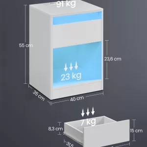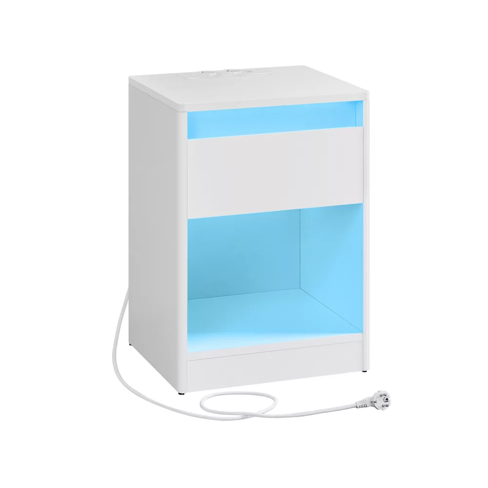 Transforma el ambiente de tu dormitorio, sala de estar o sala de juegos con esta Mesilla de Noche con Tiras LED Dobles y Estación de Carga. Con un diseño moderno y funcional, combina almacenamiento práctico, iluminación personalizable y una estación de carga integrada para satisfacer todas tus necesidades.