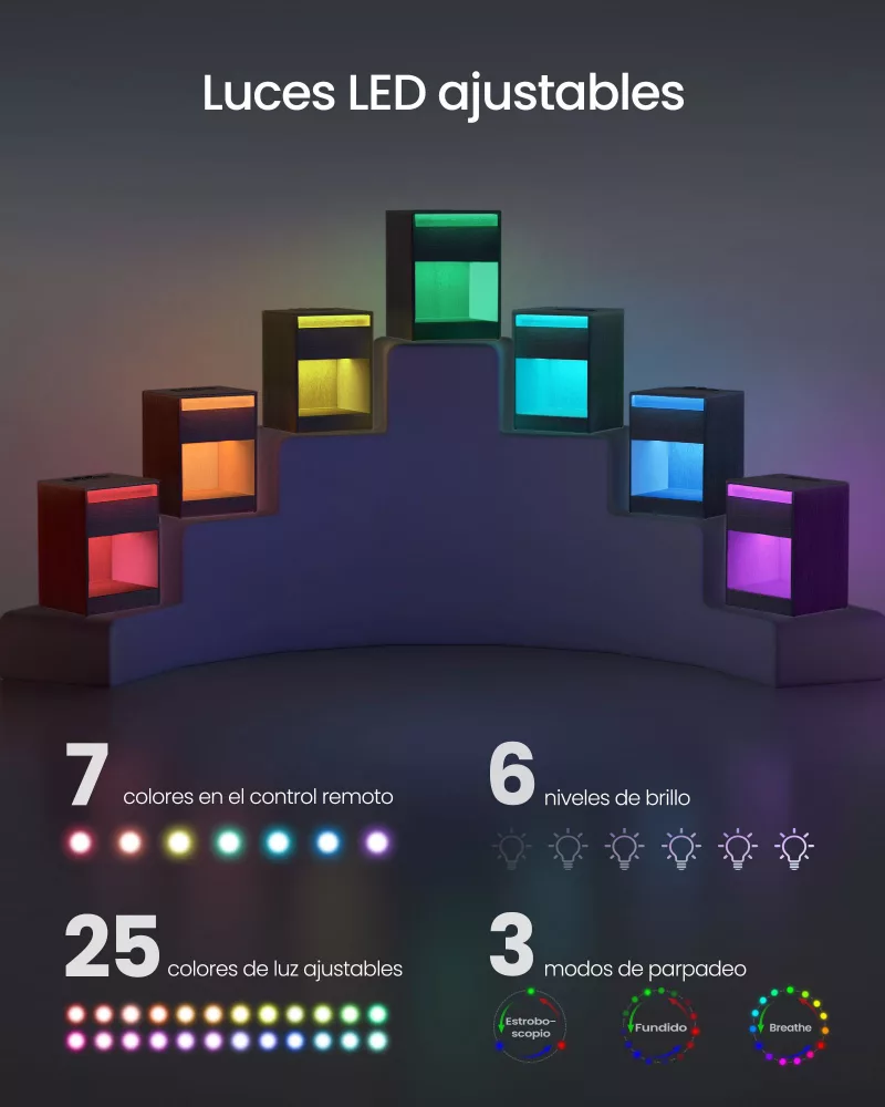 Transforma el ambiente de tu dormitorio, sala de estar o sala de juegos con esta Mesilla de Noche con Tiras LED Dobles y Estación de Carga. Con un diseño moderno y funcional, combina almacenamiento práctico, iluminación personalizable y una estación de carga integrada para satisfacer todas tus necesidades.