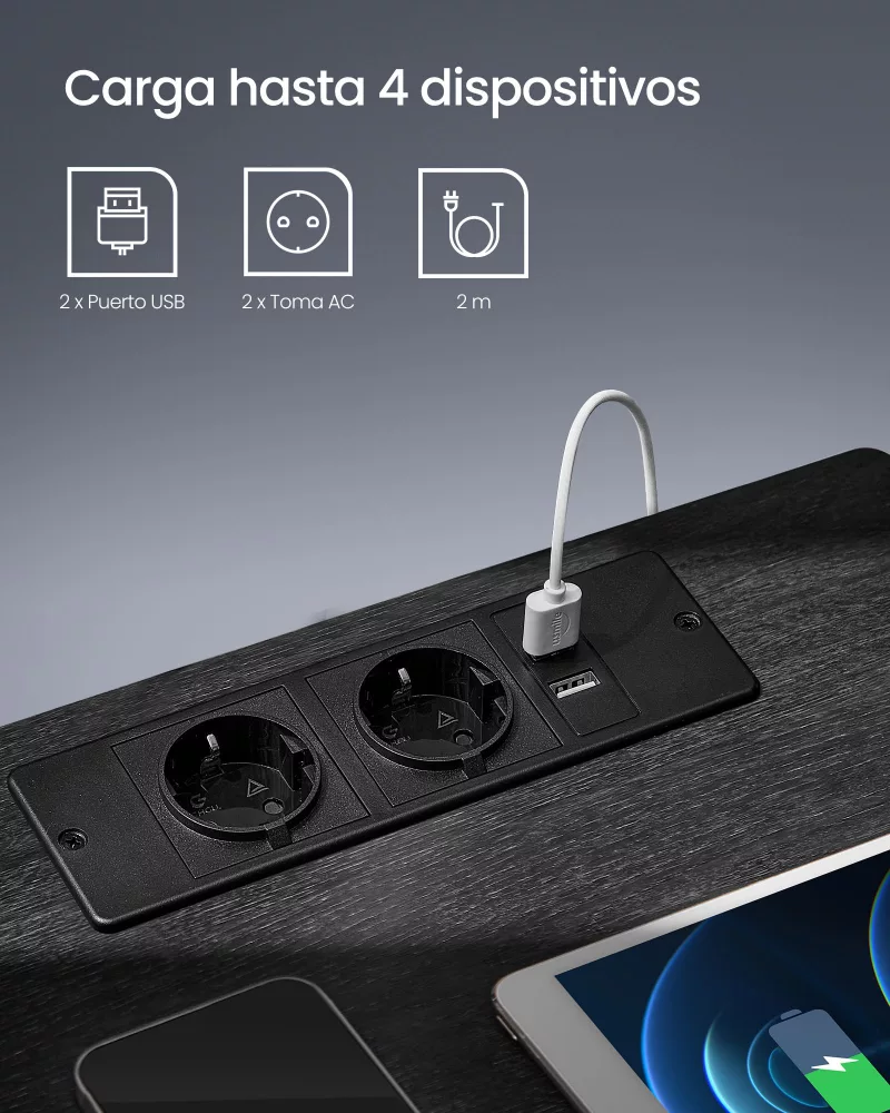 Estación de Carga Integrada: Olvídate del desorden de cables con la regleta integrada que incluye 2 tomas AC, 2 puertos USB y un cable de extensión de 2 metros. Carga hasta 4 dispositivos simultáneamente desde la comodidad de tu cama o sofá. Además, la caja de cables en la parte posterior mantiene todos los cables ocultos, ofreciendo un aspecto limpio y ordenado.