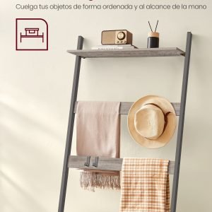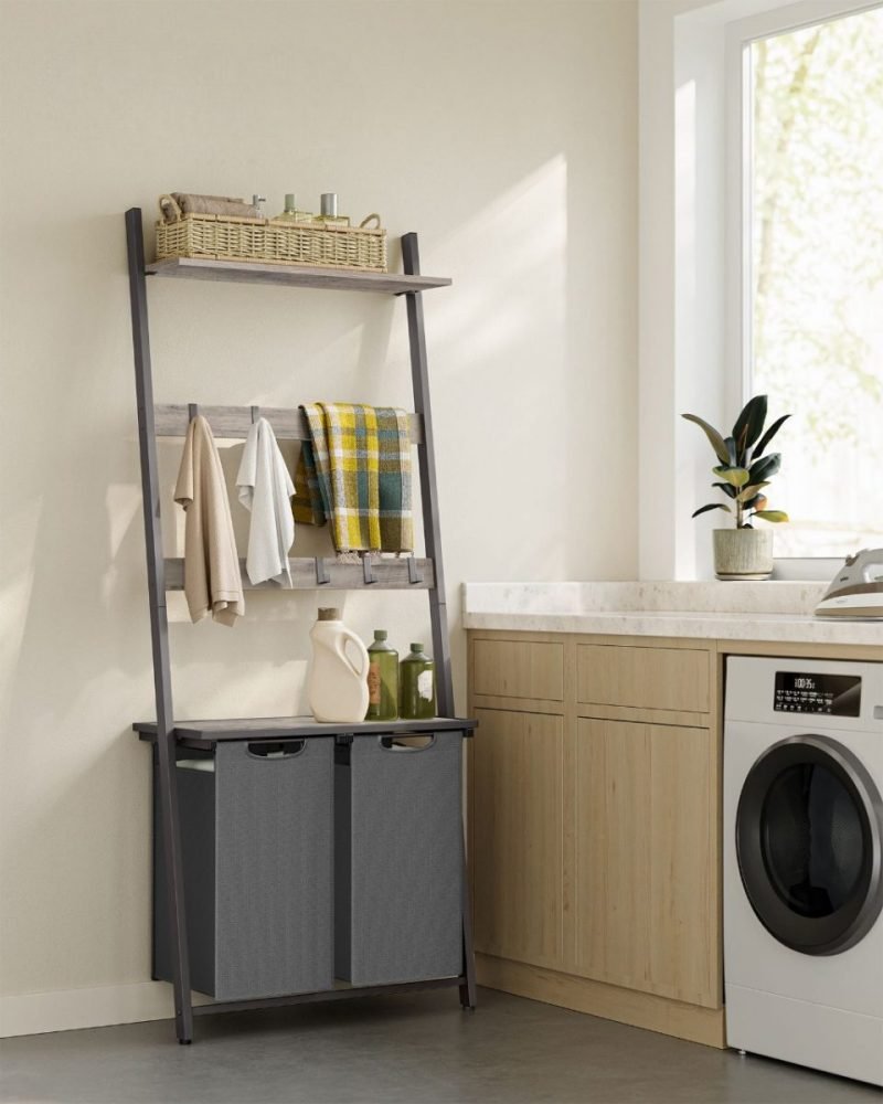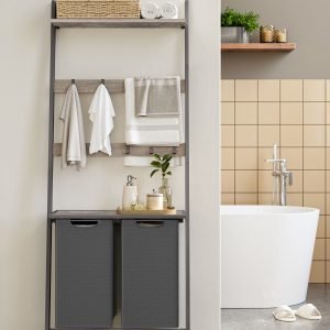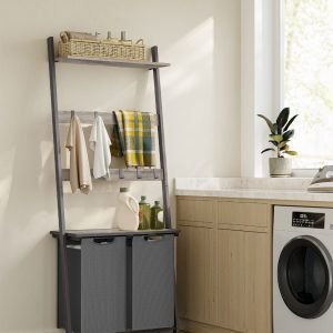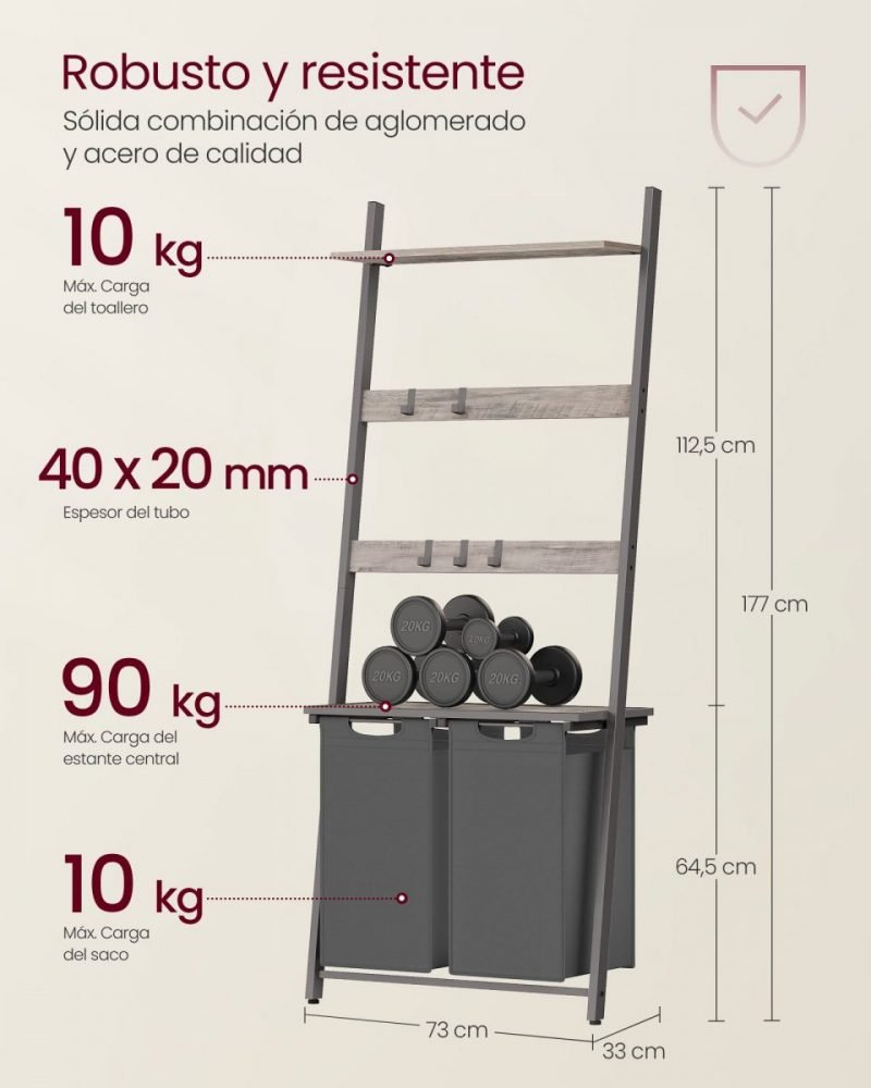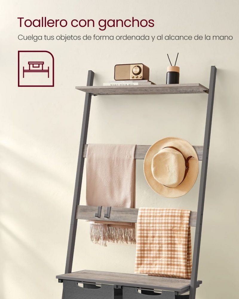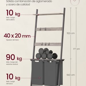 Además de las bolsas para ropa, este cesto cuenta con un estante útil en la parte superior para almacenar artículos de aseo, detergentes y suavizantes. Este estante también sirve como soporte para doblar la ropa cómodamente. El toallero con 5 ganchos es ideal para colgar toallas y mantas, añadiendo aún más funcionalidad al conjunto.