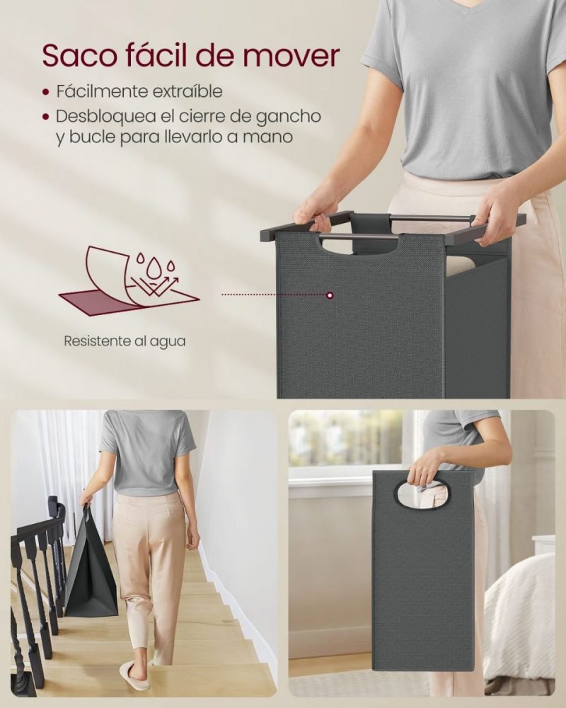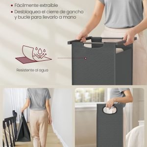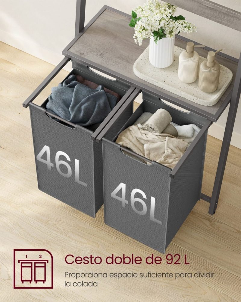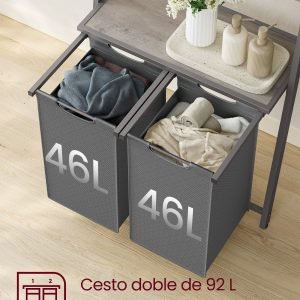 Este cesto para ropa sucia es la solución ideal para mantener tu ropa organizada. Con una capacidad total de 92 litros (46 litros por bolsa), es suficientemente amplio para guardar la ropa de toda la familia durante una semana. Su diseño de 2 compartimentos facilita la separación y organización de la ropa según el tipo.
