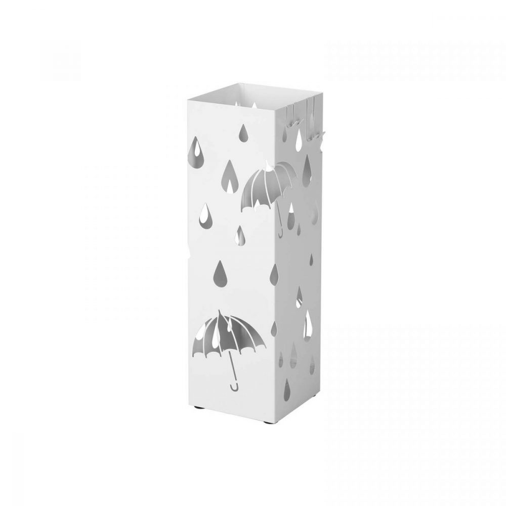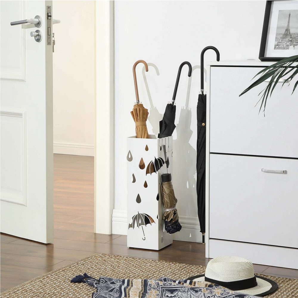 Accesorios Prácticos: Incluye un plato de plástico en la base para recoger el agua, manteniendo el suelo protegido de la humedad. Además, cuenta con dos ganchos especiales para colgar paraguas plegables, maximizando su utilidad.
