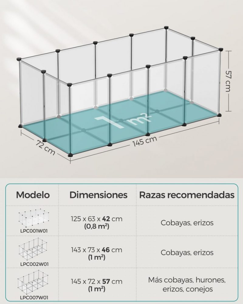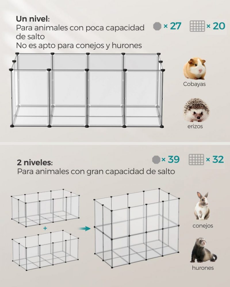 Crea un espacio seguro y estimulante para tus mascotas pequeñas con nuestro parque de juego modular. Diseñado pensando en la comodidad de tus cobayas, hámsters, erizos, o conejos, este recinto ofrece el equilibrio perfecto entre diversión y seguridad, garantizando un entorno donde puedan jugar, explorar y descansar a gusto.