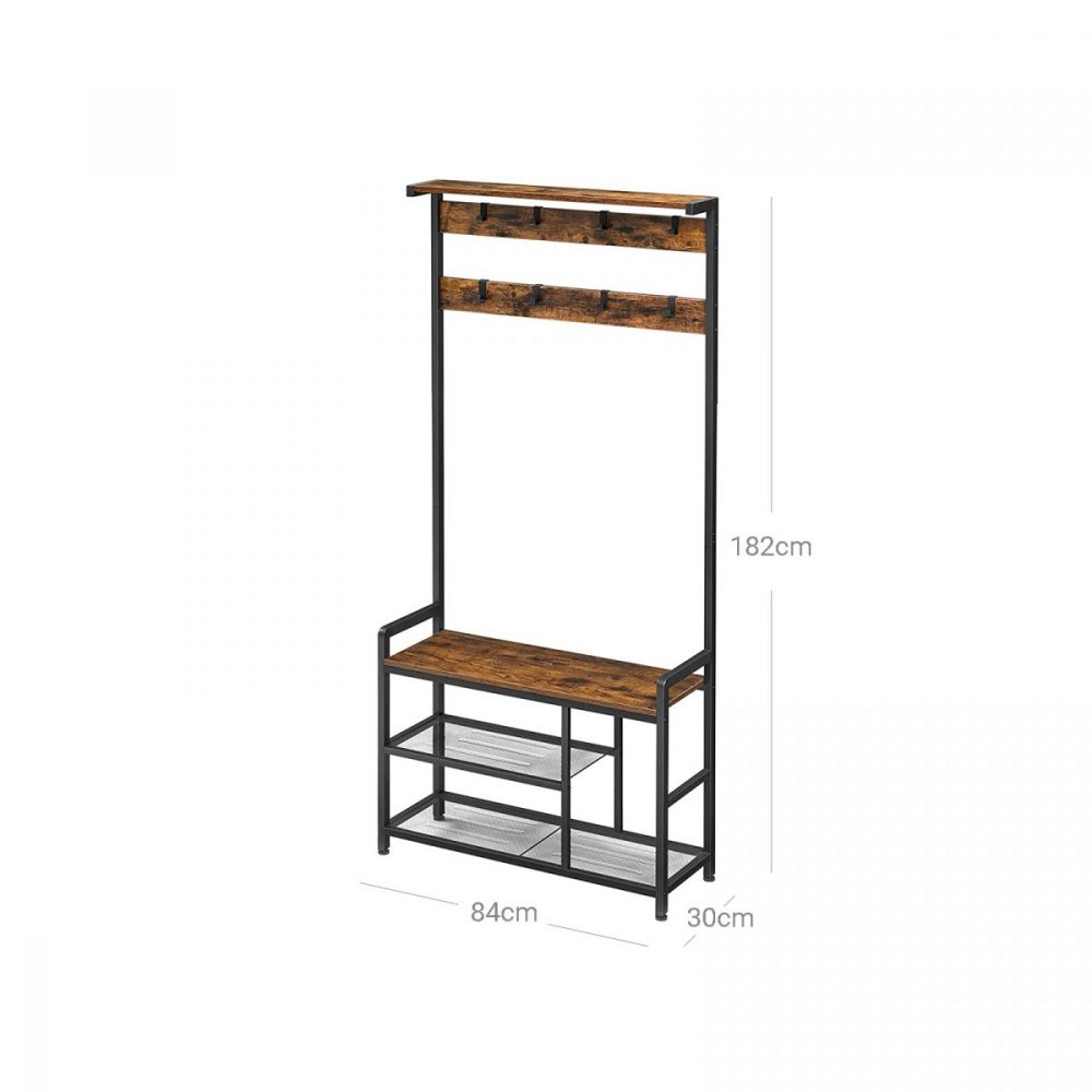 Diseñado para la Organización y Conveniencia: Con 8 ganchos en 2 filas, cada uno capaz de soportar una carga estática máxima de 2 kg, este perchero ofrece amplio espacio para colgar abrigos, sombreros y bufandas. El banco incorporado, que soporta hasta 90 kg, te permite sentarte cómodamente para cambiarte los zapatos, mientras que el estante de malla adicional es perfecto para almacenar botas y otros objetos voluminosos.