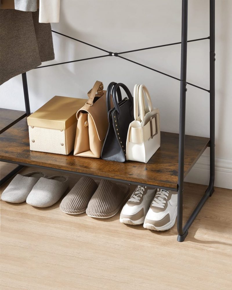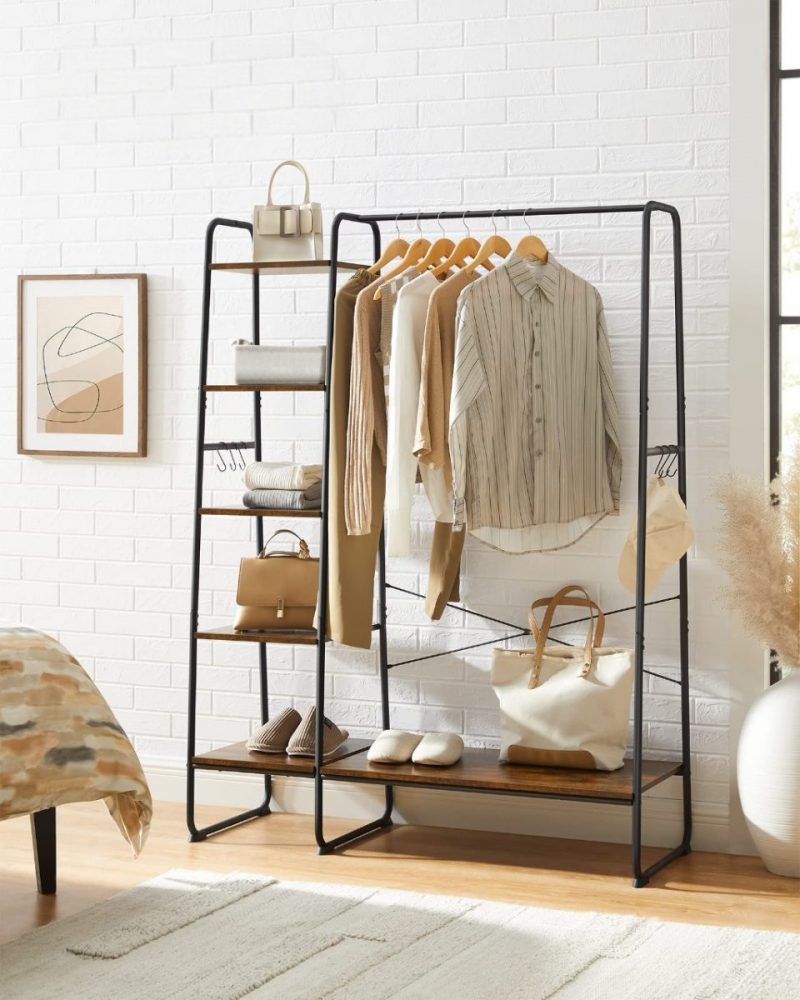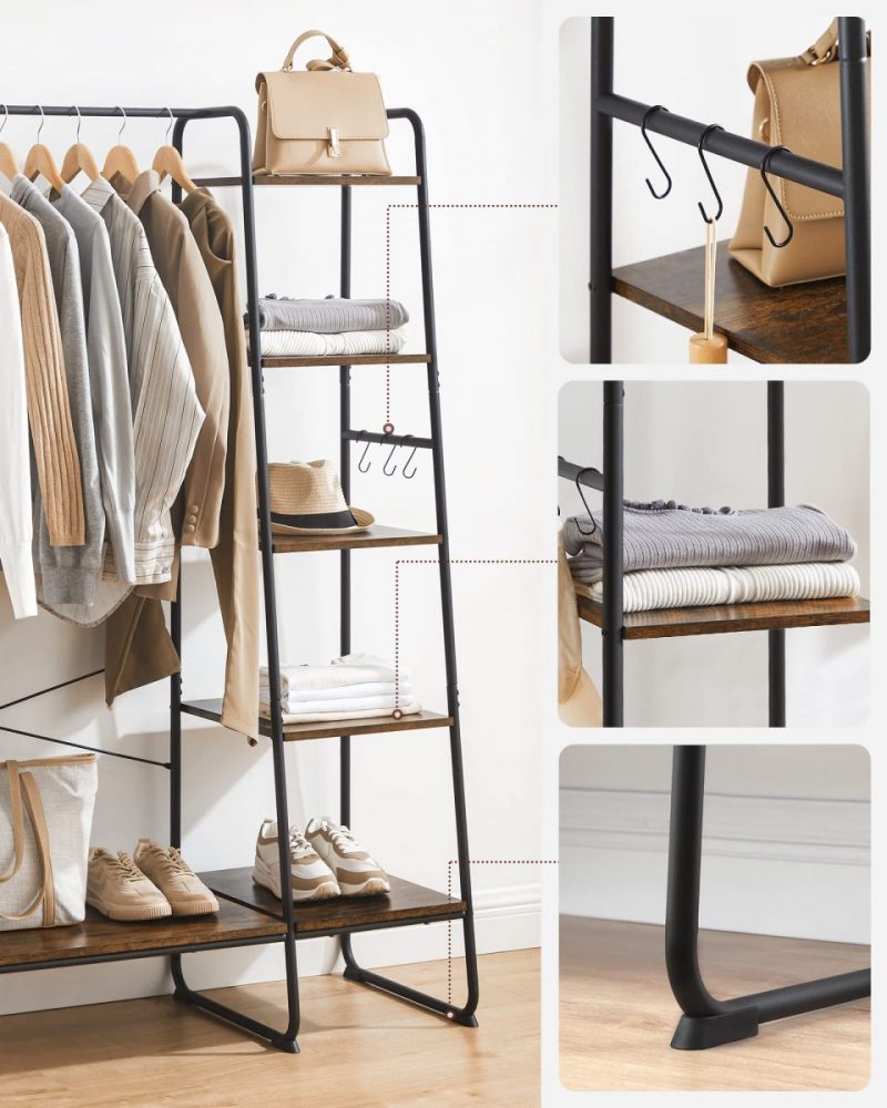 Diseño Multifuncional: Incluye múltiples opciones de almacenamiento como una barra para colgar, estante para zapatos, cinco estantes y seis ganchos, ideal para organizar diversos artículos en un solo lugar.