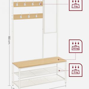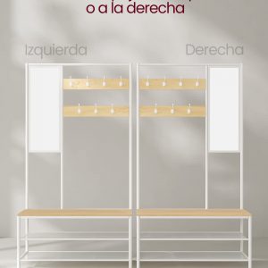 Dale la bienvenida a este perchero 4 en 1 que no solo organiza sino que embellece tu entrada. Con 7 ganchos, un amplio banco de 98 cm, 2 estantes ajustables y un espejo personalizable a la izquierda o a la derecha, este mueble se convierte en tu aliado perfecto para mantener todo lo necesario a mano antes de salir.