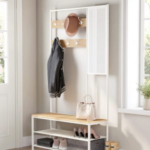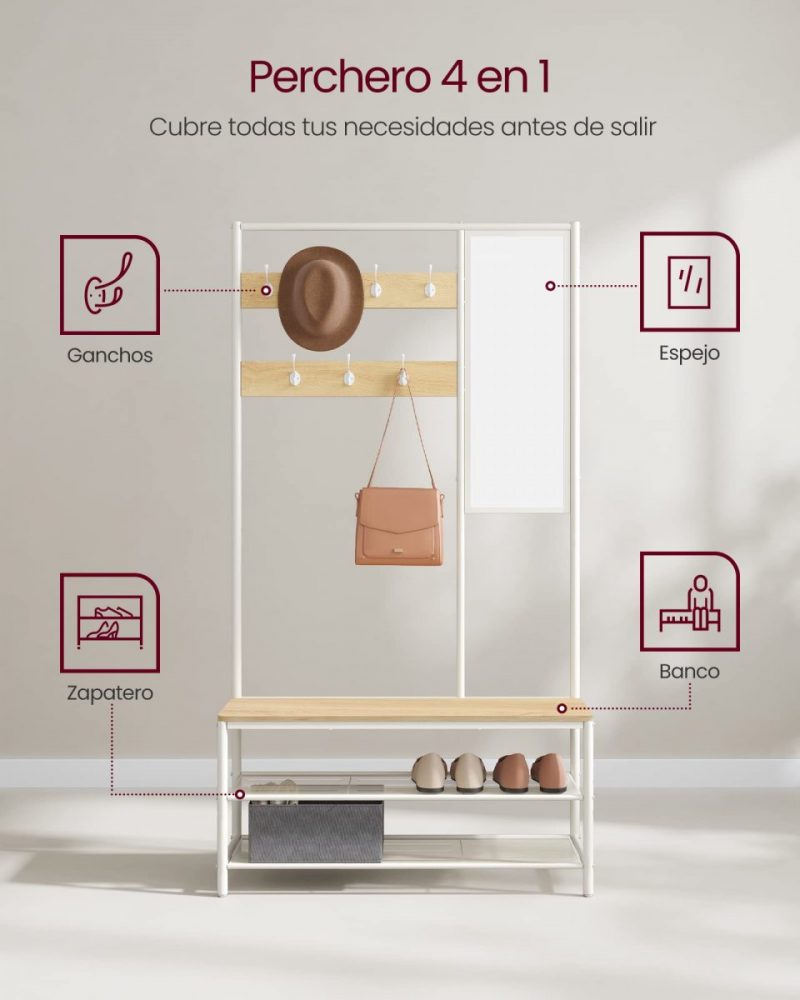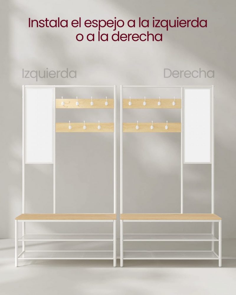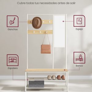 Versatilidad de Uso: Organiza abrigos, sombreros, bolsos y zapatos. El espejo ajustable te permite un último vistazo antes de salir, asegurándote de que siempre estés perfecto.