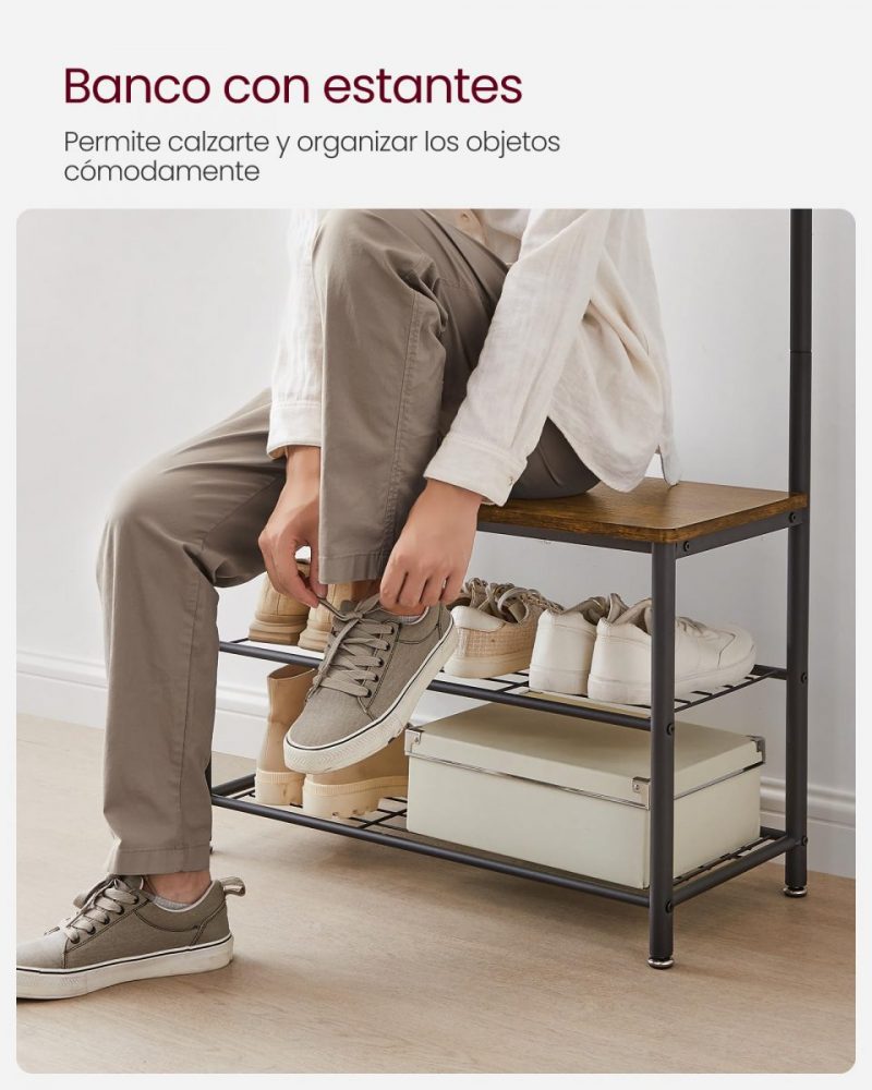 El banco debajo del perchero permite sentarte cómoda y tranquilamente gracias al tablero de aglomerado con capacidad para 100 kg. También puedes utilizarlo para organizar cajas de zapatos y almacenaje, plantas o decoraciones.