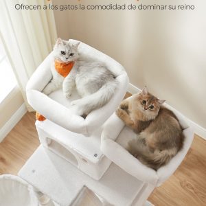 Esta torre para gatos es un verdadero centro de entretenimiento con 2 plataformas, 2 cuevas, 1 cesta, 2 pompones, y 1 hamaca, cubierto de suave felpa para proporcionar una variedad de experiencias de descanso y juego. Ideal para hogares con varios gatos, permite que cada uno encuentre su rincón favorito para relajarse o jugar.