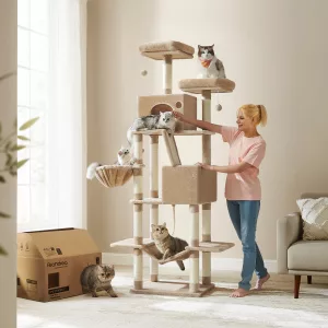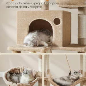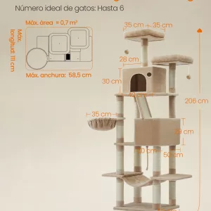 Altura Impresionante: Con una altura de 206 cm, este árbol para gatos es ideal para gatos a los que les gusta trepar y disfrutar de lugares altos. La distancia corta entre niveles facilita la subida y bajada.