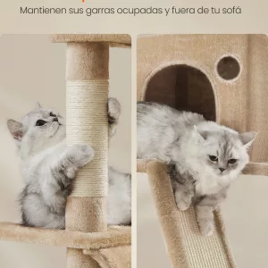 Casa para Gatos Segura: Fabricado con un robusto tablero de aglomerado para mayor durabilidad, una amplia base reforzada para estabilidad y un dispositivo de fijación para seguridad, este árbol es estable y seguro para hasta 6 gatos (máx. 7 kg cada uno).