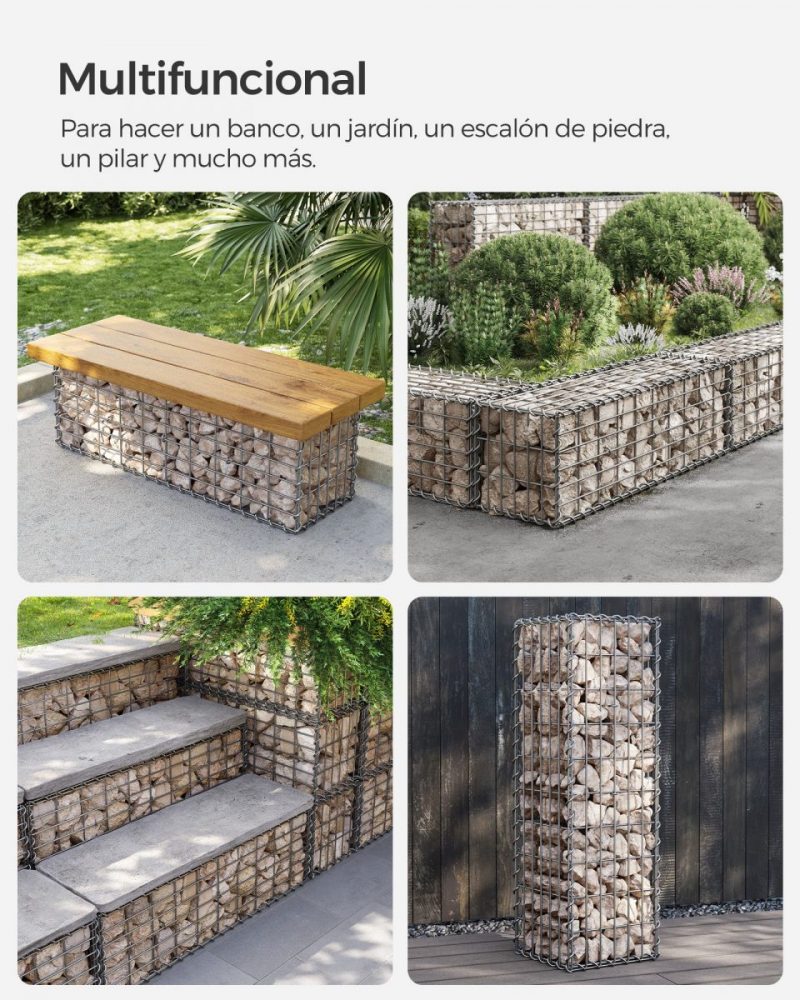 Diseño Personalizable y Multifuncional: Úsalas como desees; nuestras cestas de gaviones pueden funcionar individualmente o en conjunto para crear estructuras únicas como jardineras, bancos, escalones de piedra o pilares, brindando infinitas posibilidades para tu jardín.