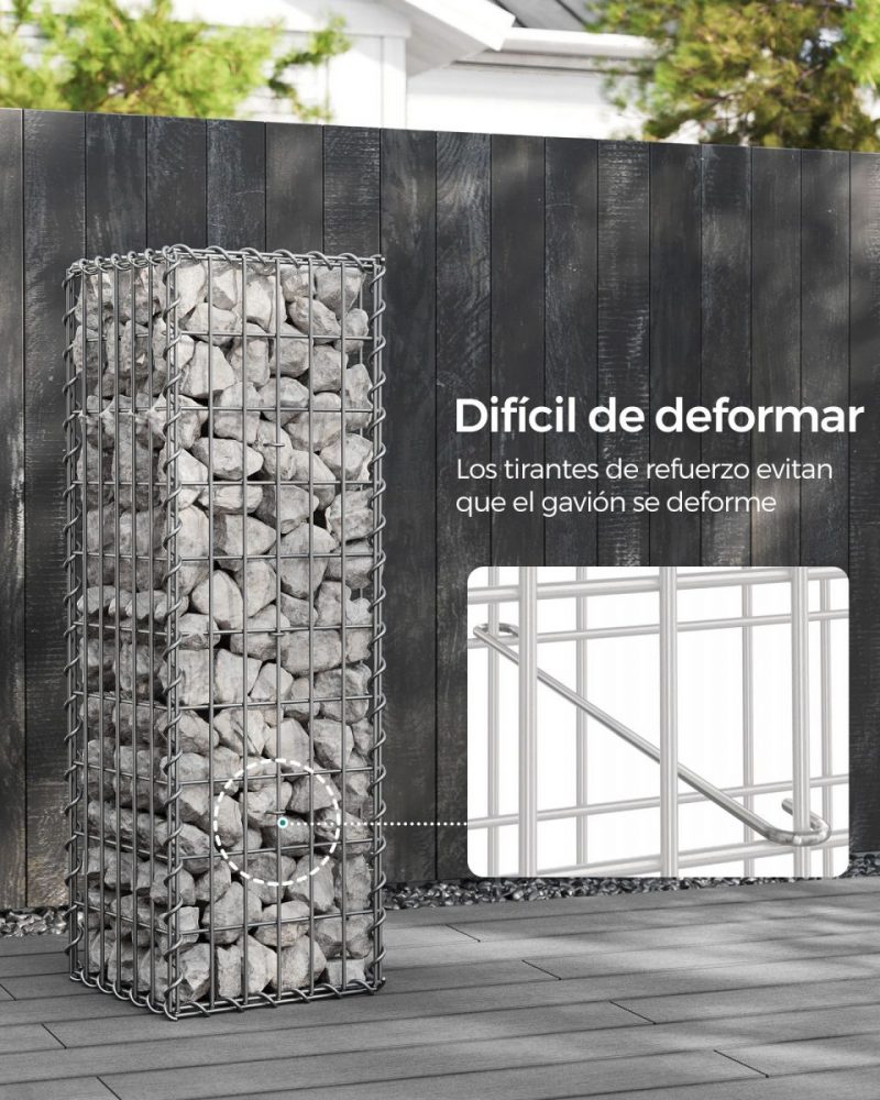 Estructura Reforzada para Evitar Deformaciones: Con 3 ganchos espaciadores que aseguran los paneles, nuestras cestas mantienen su forma perfectamente, incluso cuando están llenas de piedras u otros materiales de relleno.