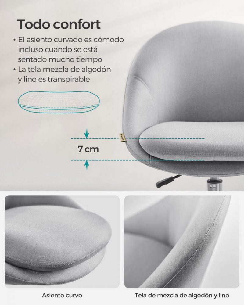 Alto Confort de Asiento: Doble cojín bien acolchado (7 cm de grosor en la parte superior) y asiento grande con forma curvada que alivia la presión sobre las caderas. La funda de mezcla de algodón y lino es transpirable.