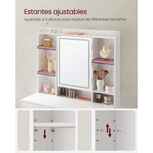 El espejo del tocador está rodeado de luces LED que se pueden cambiar a 3 colores (blanco cálido, blanco natural y blanco frío) y ajustar la intensidad. Esto permite crear la iluminación perfecta para el maquillaje, ya sea que estés buscando una luz brillante para ver todos los detalles o una luz más suave para crear un look natural.