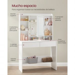 Este tocador ofrece mucho espacio de almacenamiento para todos tus productos de belleza, joyas y otros artículos. Cuenta con un estante superior para el perfume, 7 compartimentos abiertos para los productos de belleza, 2 estantes y ganchos para las joyas detrás del espejo, 1 estante grande, 2 cajones y 1 estante en la parte inferior.