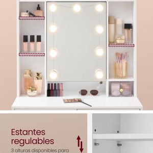 Iluminación Personalizable: Con 9 bombillas que ofrecen 3 tonos diferentes e intensidad ajustable, este tocador te permite encontrar la iluminación perfecta para cualquier momento del día o noche.