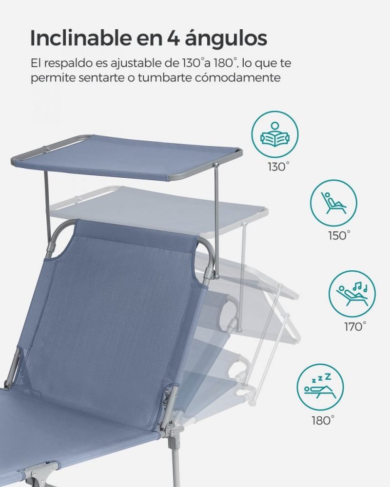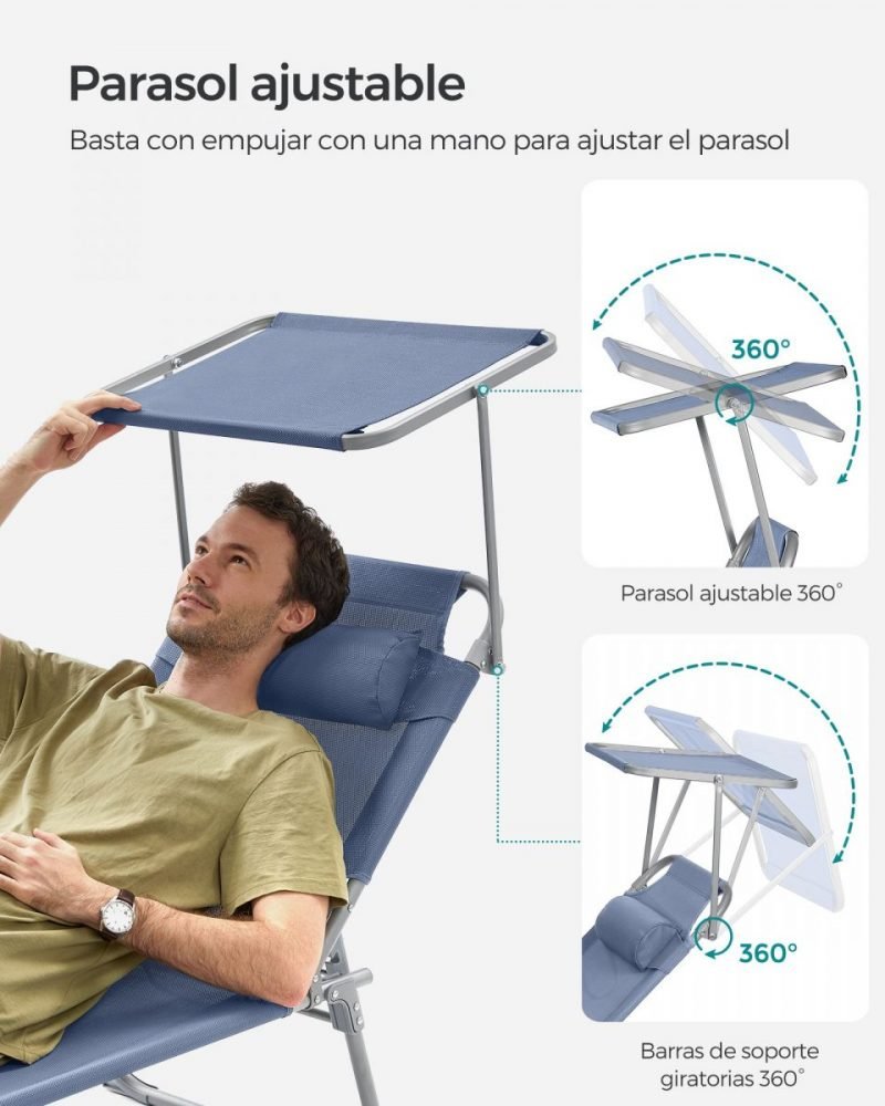 Sombrilla Ajustable: Incluye una sombrilla regulable que puedes ajustar fácilmente con la mano para bloquear el sol y leer o relajarte sin deslumbrarte. La sombra adicional permite una experiencia más cómoda bajo el sol.