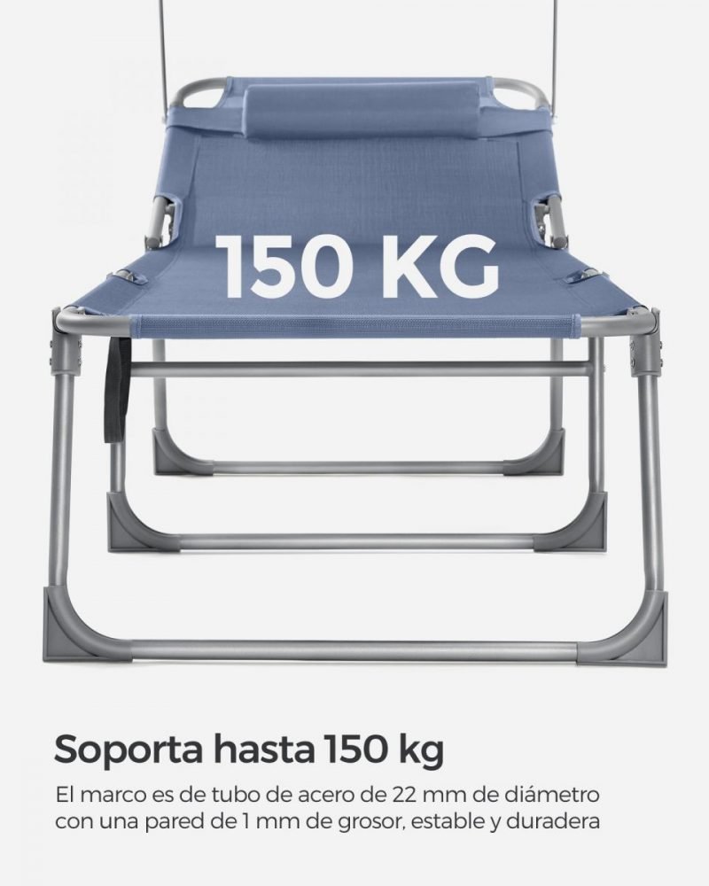 Estabilidad y Durabilidad: Su marco de acero con recubrimiento de polvo y juntas reforzadas soportan hasta 150 kg. Los pies antideslizantes proporcionan mayor estabilidad, asegurando que la tumbona se mantenga firme en todo momento.