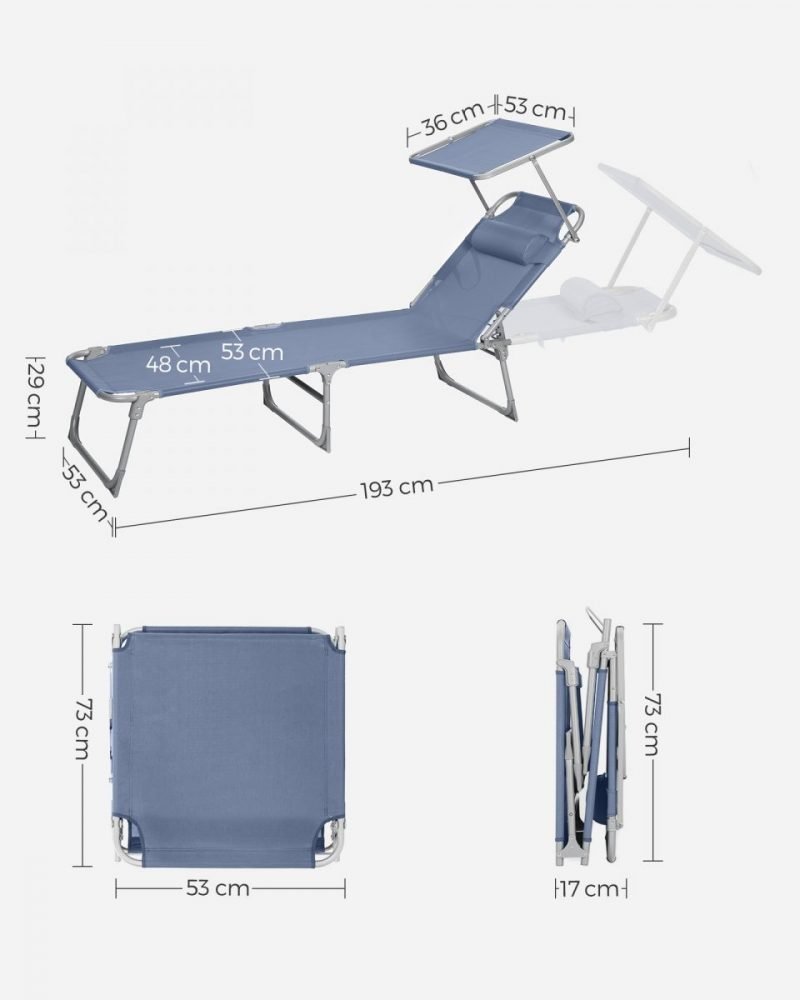 Relájate y disfruta del sol con esta tumbona plegable y portátil, ideal para el patio, la piscina o el jardín. Con un diseño funcional que incluye un respaldo ajustable, tela transpirable y sombrilla regulable, esta tumbona es la elección perfecta para descansar cómodamente en el exterior.